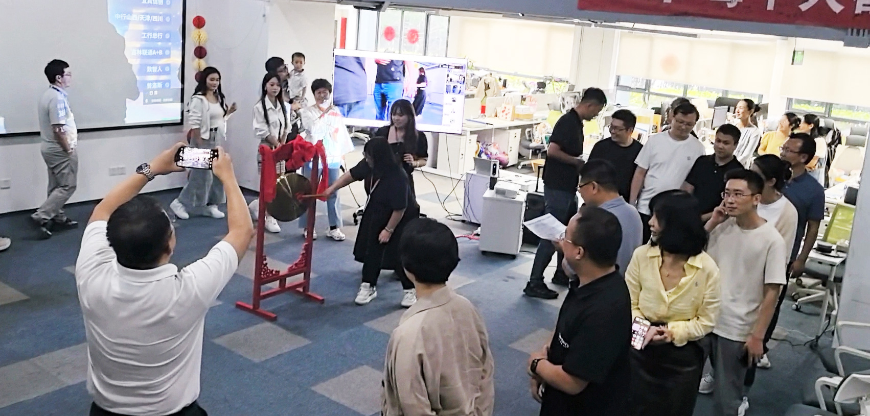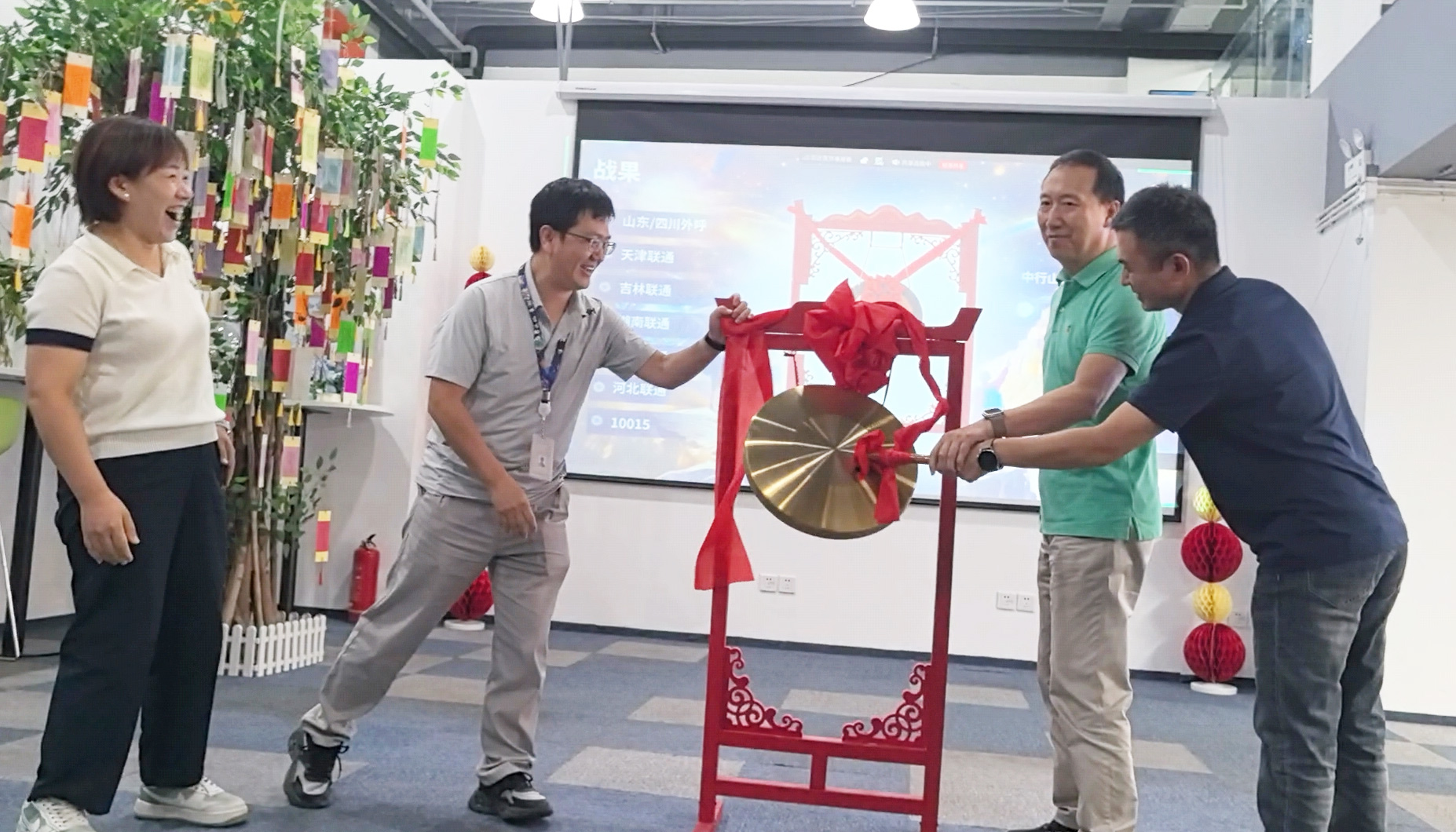 熟悉的敲锣古板如约回归!项目功勋成员配合敲响庆功锣,,,,,锣声里是对过往的喝彩,,,,,更是对未来的期许。。。。。合影定格优美,,,,,高管与部分认真人共切五周年蛋糕,,,,,为盛会画上圆满句号。。。。。